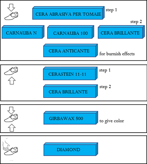 APPLY by sponge uniformly on the whole upper, let it dry for around 3-4 minutes and then polish by cotton brush and CERA ABRASIVA PER TOMAIA. After the first brusing, to increase the glossy effect polish by woollen brush and CARNAUBA 100 (800-900 rpm).